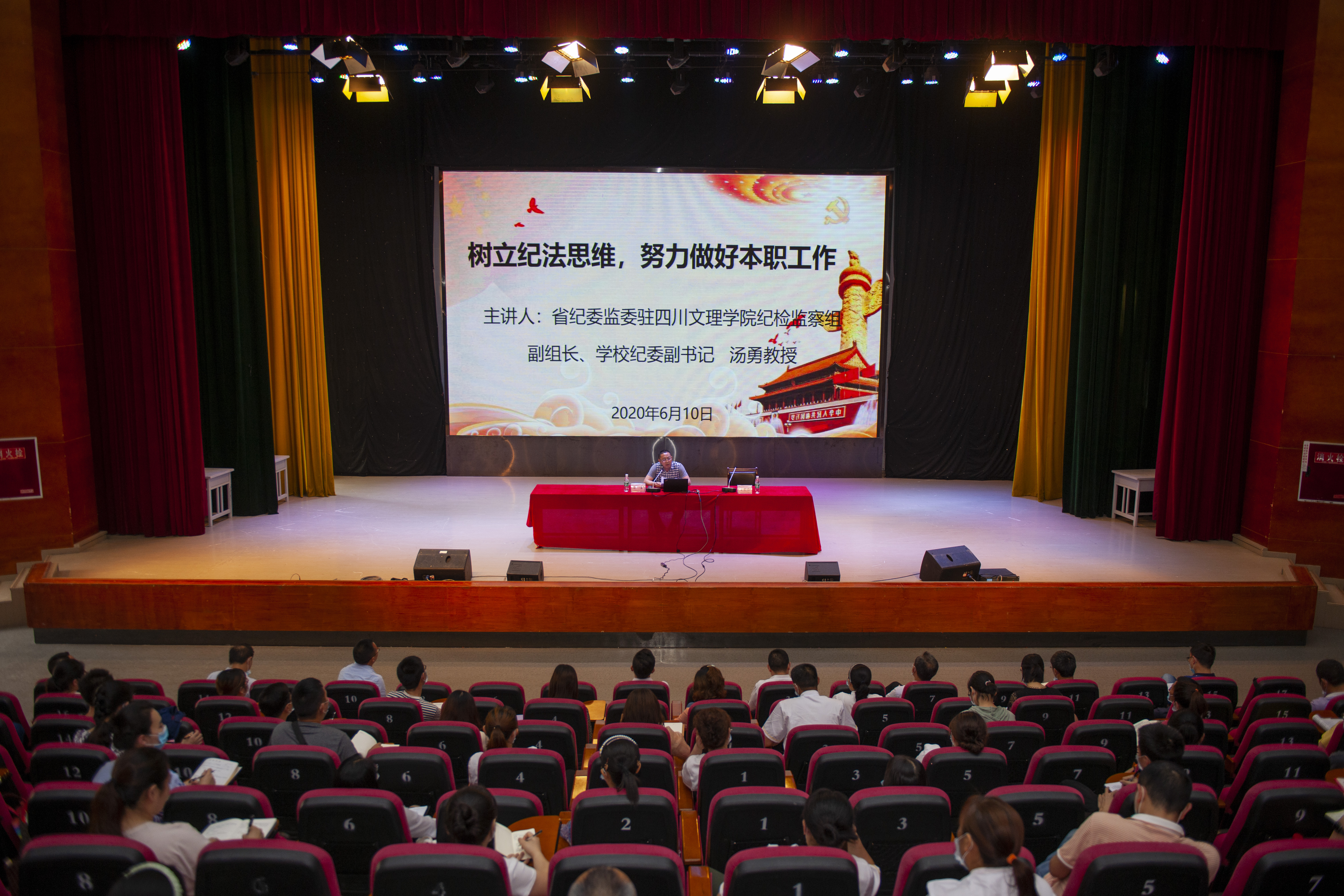 为进一步抓好全面从严治党工作落实,强化队伍建设,2020年6月10日下午,机关第四党总支邀请了省纪委监委驻学校纪检监察组副组长、学校纪委副书记汤勇教授上党风廉政建设专题党课。副校长朱兴华、基建处、计划财务处、国有资产管理处、公共资源交易服务中心、后勤服务处、博大资产管理有限公司全体员工共120余人在艺术传媒大楼多功能厅聆听了党课报告。党课学习会由总支书记曾宪志主持。